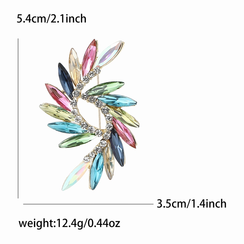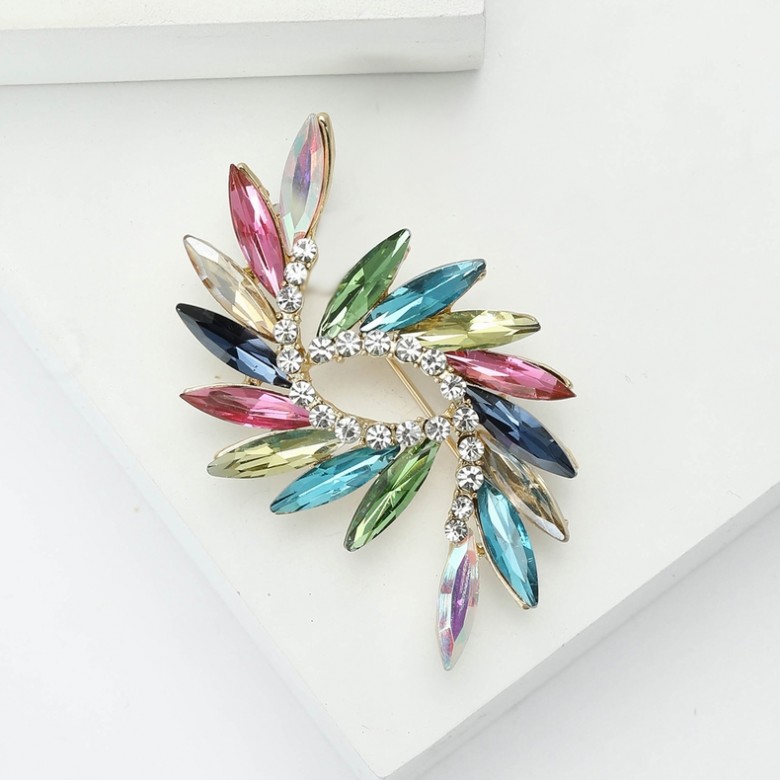 These high-end creative rainbow vortex brooches are made of alloy and rhinestones